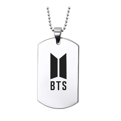 Army tag long necklace with bias Korean name in Hangul and year of birth. Printing is on one side only.
