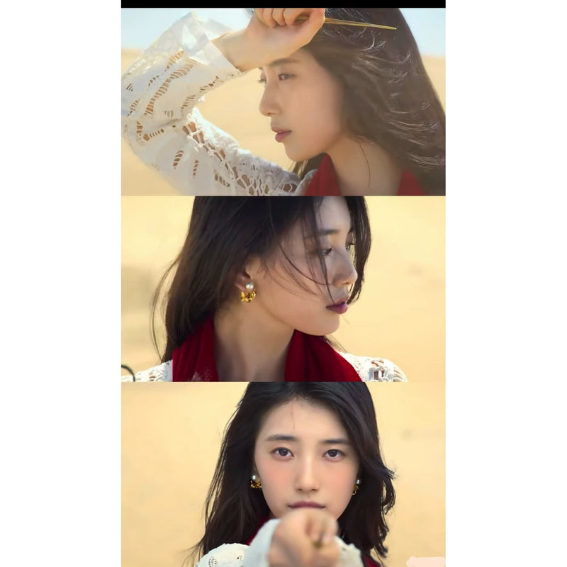 An elegant and minimalist design inspired by Kdrama Genie, Make A Wish Ga-Young (Bae Suzy) Gold Abstract Earrings with Pearl. Each earring showcases a single round white pearl set on a textured gold metal base. The gold base has an organic, sculptural form—almost like molten or crumpled gold—giving the earrings a refined yet artistic look. The pearls add a soft, classic touch that contrasts beautifully with the modern irregularity of the gold setting.